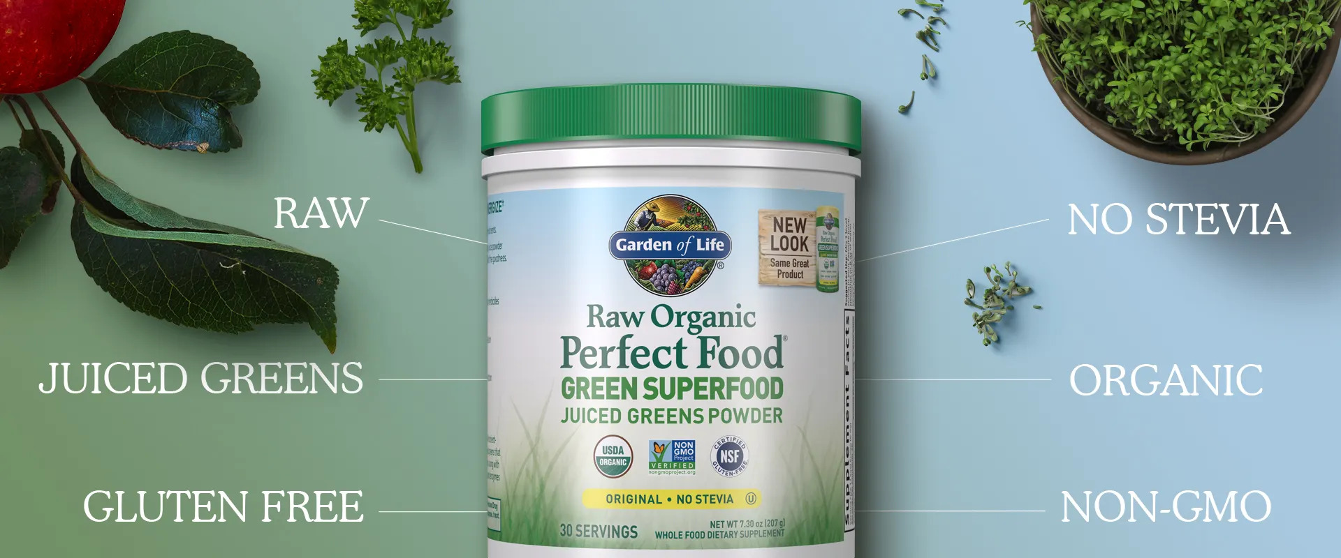 Raw Organic Perfect food là thực phẩm bổ sung dinh dưỡng nguyên chất, hữu cơ, cung cấp chất diệp lục tự nhiên, chất chống oxy hóa, enzyme, axit amin, axit béo thiết yếu và hàng chục chất dinh dưỡng thực vật. Bùng nổ với prebiotic, men vi sinh và enzyme để hỗ trợ tiêu hóa khỏe mạnh và hấp thụ chất dinh dưỡng, Raw Organic Perfect food là cách thuận tiện, ngon miệng để bạn có được nước ép rau mỗi ngày.