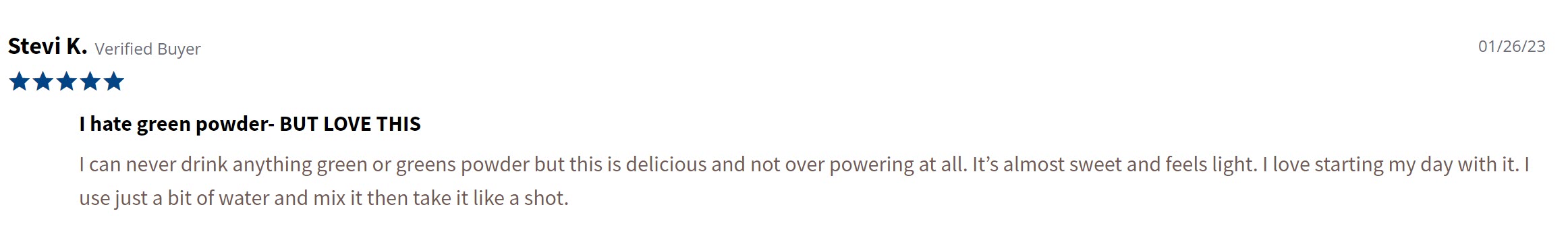 Nó chứa đầy năng lượng của 40 loại rau xanh, rau mầm và nước ép rau hữu cơ, đậm đặc chất dinh dưỡng để cung cấp năng lượng thô mà bạn cần mỗi ngày. Cỏ hữu cơ được ép và sấy khô ở nhiệt độ lạnh ngay tại trang trại trong một giờ thu hoạch, khóa chất dinh dưỡng tập trung mà mọi người tìm kiếm trong một chất bổ sung rau xanh.