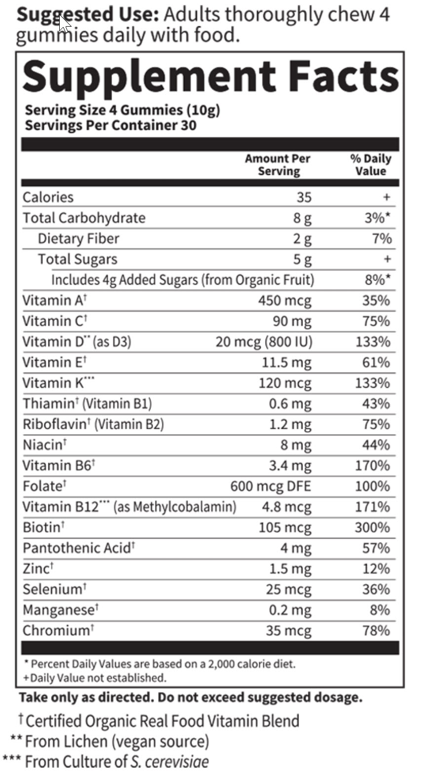 Dòng kẹo dẻo Mykind Organics là một cuộc thập tự chinh sức khỏe thực sự, từ bỏ chế độ kẹo dẻo vitamin thông thường bằng cách loại bỏ các loại đường và si rô đã qua chế biến, màu nhân tạo và hương liệu, sản phẩm động vật và GMO. Với công nghệ làm kẹo dẻo sạch của Mykind Organics, không có thành phần "kẹo", không có gelatin lợn hoặc tinh bột ngô. Bạn có thể yên tâm rằng bạn đang nhận được một viên nhai trái cây chứa vitamin toàn phần thực phẩm không chỉ tốt cho bạn mà còn rất ngon!