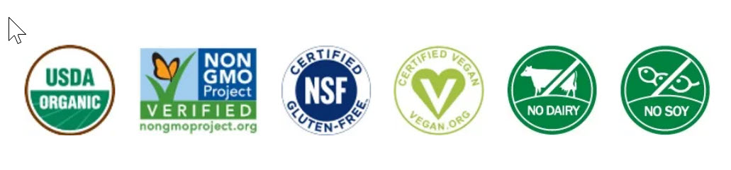 Sản phẩm được chứng nhận USDA Organic & Non-GMO, chứng nhận Vegan & NSF Chứng nhận Gluten Free