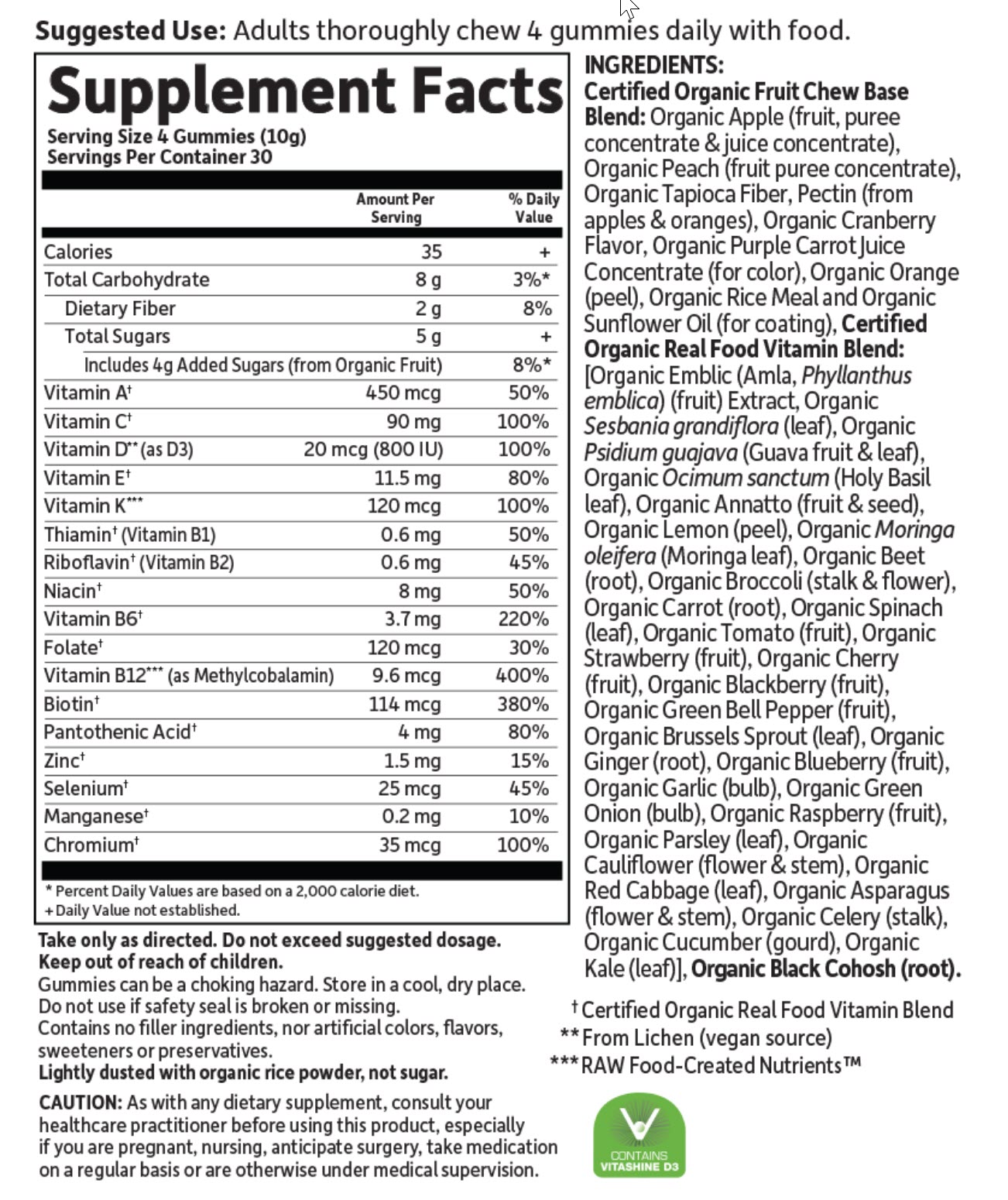 Được sản xuất bằng các nguyên liệu hoàn toàn từ thực phẩm, mykind Organics Women’s Multi 40+ Gummies có các thành phần nhắm mục tiêu để hỗ trợ nhu cầu của phụ nữ trên 40 tuổi bao gồm Organic Black Cohosh và 800IU Vegan D3.