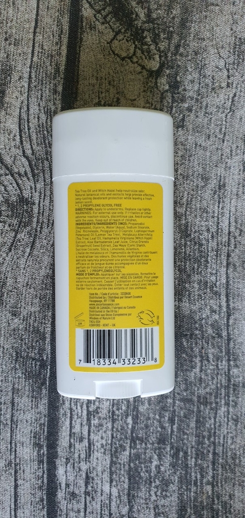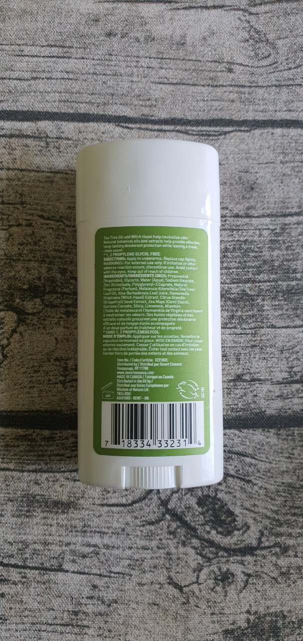 Công thức khử mùi có mùi cam quýt với Tinh dầutràm Trà Úc nguyên chất, Tinh dầu Trà Chanh và Lô hội. Công thức không chứa nhôm giúp bảo vệ mùi lâu dài.