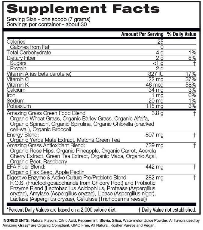- Hỗn hợp Amazing grass hữu cơ: cỏ lúa mì hữu cơ, cỏ lúa mạch hữu cơ, cỏ linh lăng hữu cơ, spirulina hữu cơ, rau bina hữu cơ, bông cải xanh hữu cơ, chlorella hữu cơ (vách tế bào bị nứt)