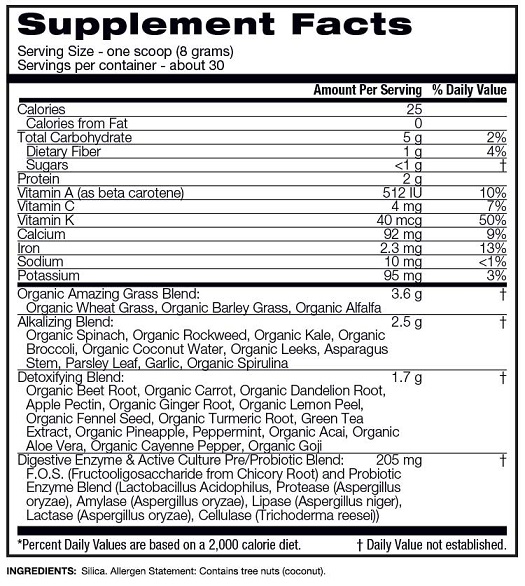 - Hỗn hợp kiềm hóa: Rau bina hữu cơ, Rong biển hữu cơ, Cải xoăn hữu cơ, Bông cải xanh hữu cơ, Nước dừa hữu cơ, Leeks hữu cơ, Thân cây măng tây, Lá rau mùi tây, Tỏi và Spirulina hữu cơ