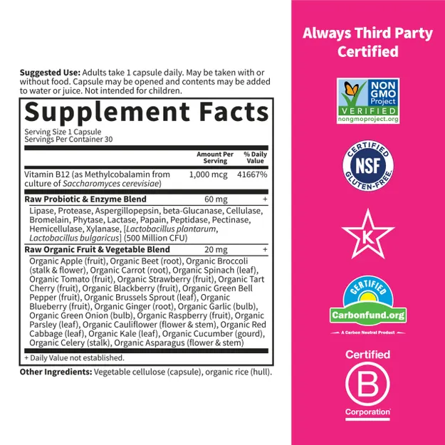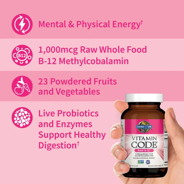 Vitamin Code Raw B-12 là một loại thực phẩm bổ sung dinh dưỡng toàn phần, được bào chế đặc biệt để cung cấp 1.000mcg—đó là con số khổng lồ 41,667% Giá trị hàng ngày của vitamin B12 ở dạng methylcobalamin hoạt động, tự nhiên. Được pha trộn trong cơ sở gồm 23 loại trái cây và rau quả có bổ sung chất chống oxy hóa, vitamin và đồng yếu tố dinh dưỡng hỗ trợ, viên nang Vitamin Code Raw B-12 được Chứng nhận Thuần chay, Dự án Không biến đổi gen Đã xác minh, Star K Kosher và NSF Chứng nhận Không chứa Gluten.