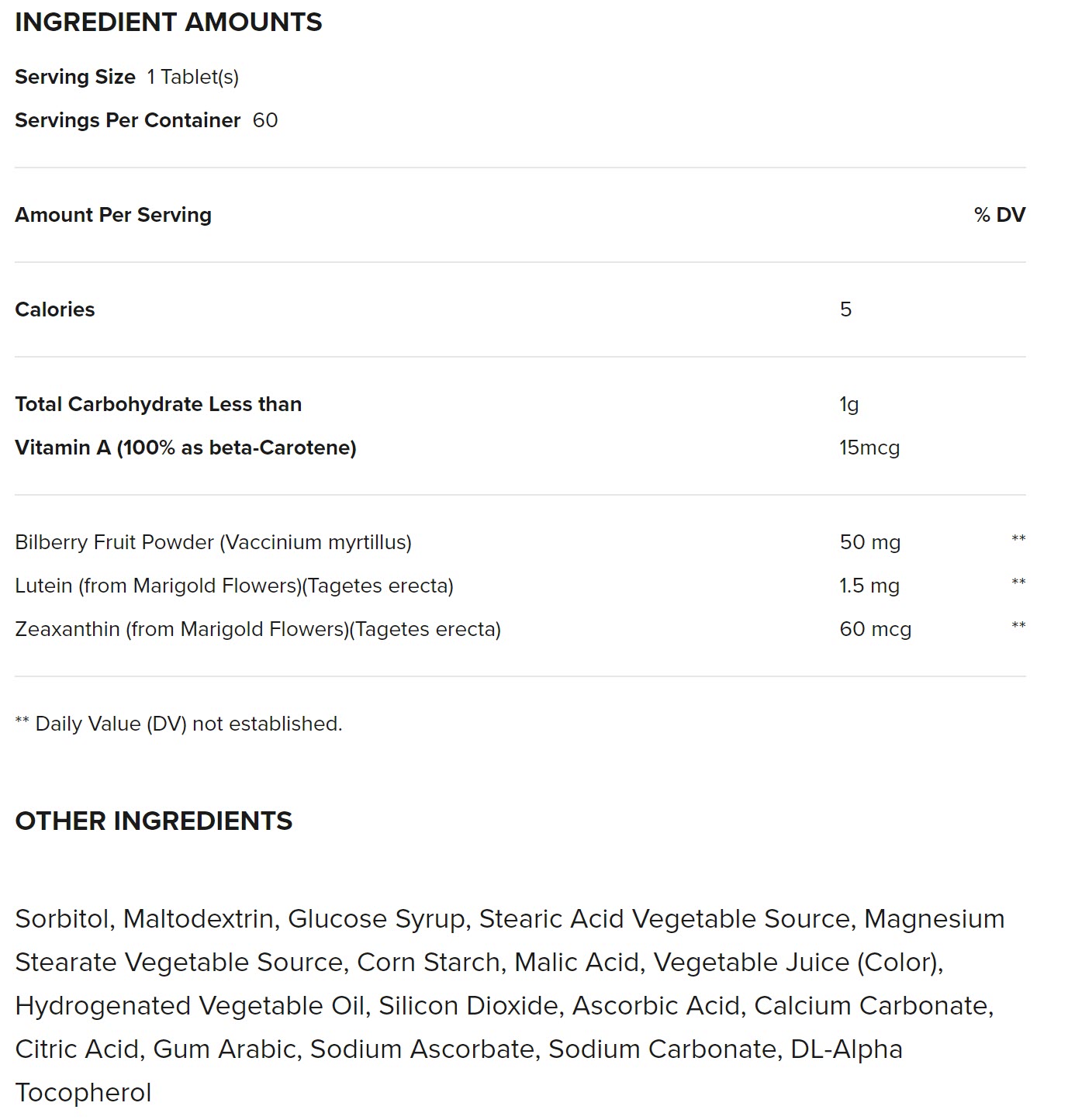 Sản phẩm với 4 chất dinh dưỡng quan trọng đặc biệt hỗ trợ cho sức khỏe của mắt: Lutein, Vitamin E, Bilberry và Zeaxanthin. Những chất này đều hỗ trợ thị lực khỏe mạnh và tăng cường sức khỏe tổng thể của mắt.