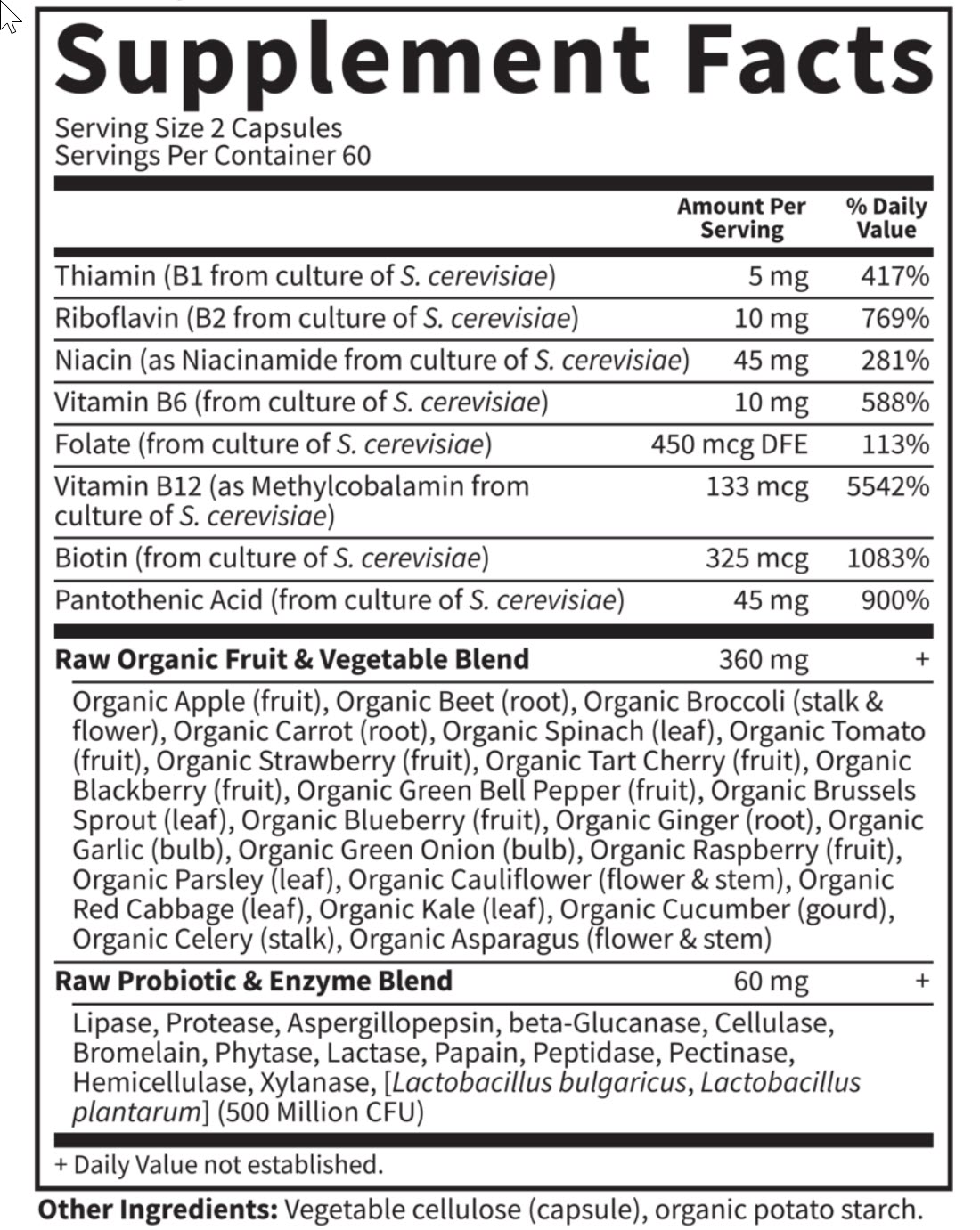 Được chế tạo với các chất dinh dưỡng được trồng riêng lẻ sử dụng canh tác probiotic để tạo ra các chất dinh dưỡng có nguồn gốc từ thực phẩm, chất bổ sung Vitamin Code được cung cấp trong toàn bộ các loại trái cây và rau quả. Bổ sung Vitamin Code là thô, không chỉ có nghĩa là chúng được sản xuất dưới 46ºC, mà còn có nghĩa là các chất dinh dưỡng này đi kèm với các yếu tố tự nhiên đồng nhất của chúng, cùng với probiotic sống và enzyme xanh, giống như thực phẩm tươi sống! Bột nguyên liệu vitamin trong viên nang không dùng bất kỳ chất kết dính hoặc chất độn.